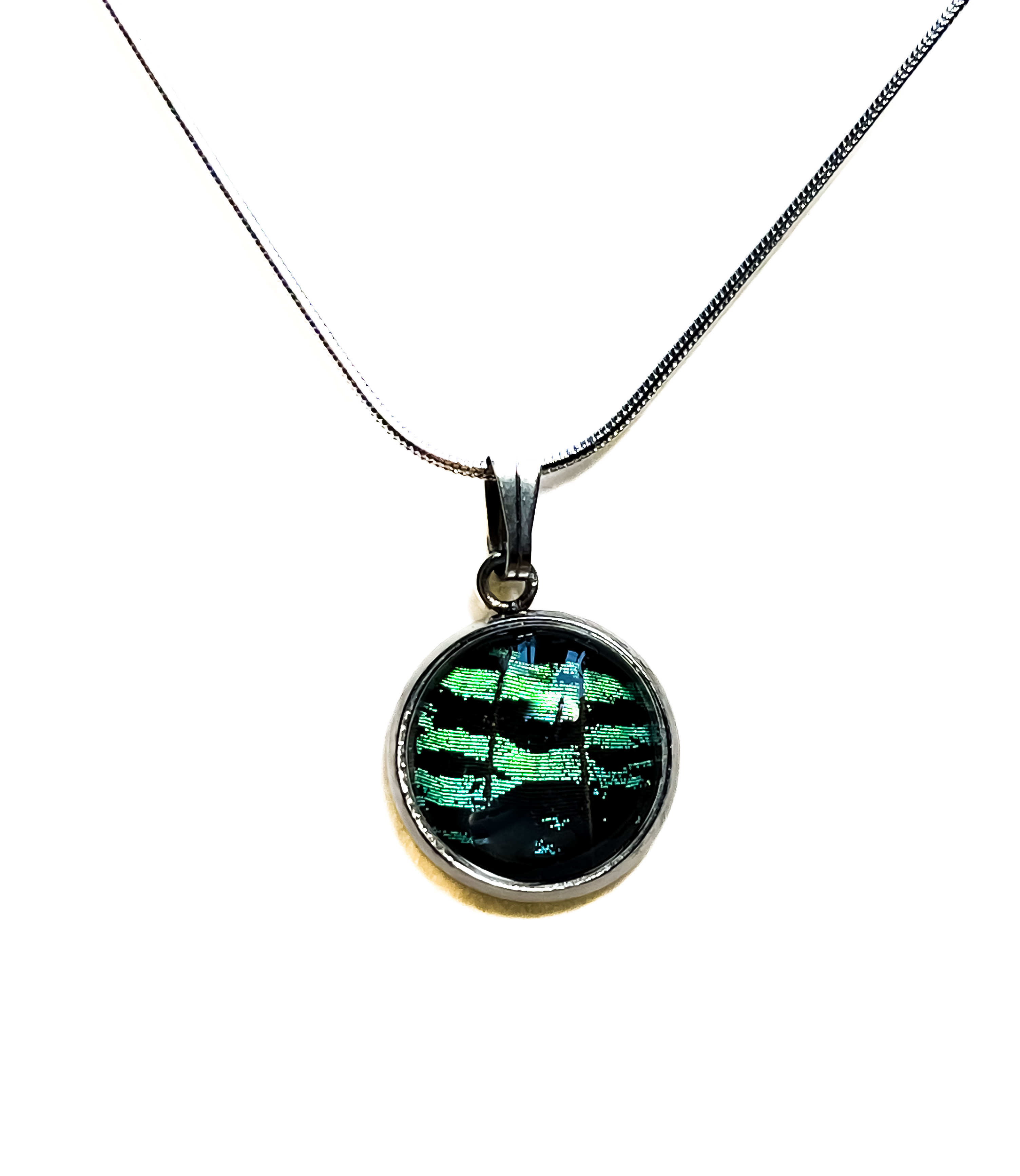 Přívěsek z křídla tropického motýla Urania rhipheus.